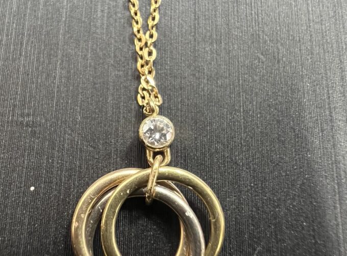 カルティエ トリニティダイヤネックレスを買取させていただきました。我孫子市よりお越しいただけました。ブランドジュエリーとなりますが美しいですね…。ブランド料もアップとなりました。